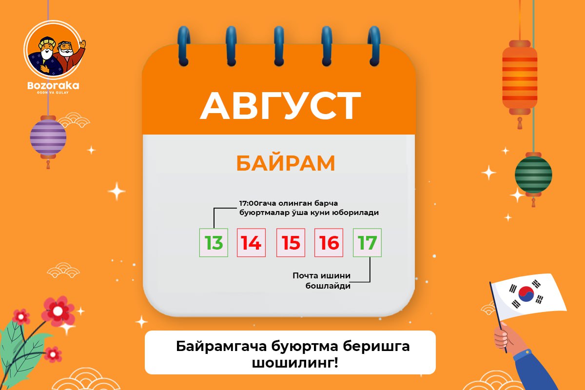 🚚13 август Чоршанба куни соат 17:00га қадар қилинган буюртмалар ўша куни юборилади. Ушбу санадан кейин қилинган буюртмалар 17 август якшанба кунидан бошлаб, мижозларимиз манзилларига жўнатилади.
