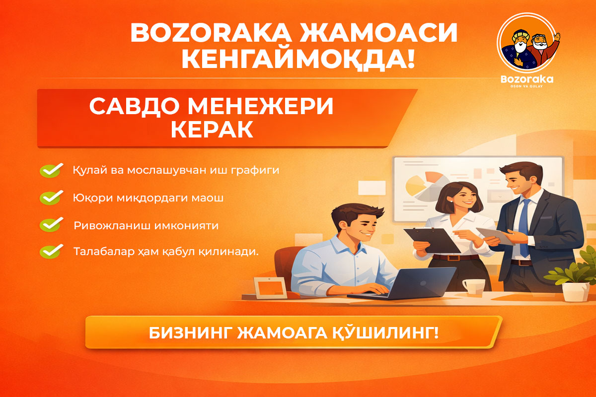 Агар сиз савдо соҳасида тажриба орттиришни, ўсишни ва энергия билан тўла жамоада ишлашни хохласангиз — ҳозироқ BOZORAKA жамоасига қўшилинг!