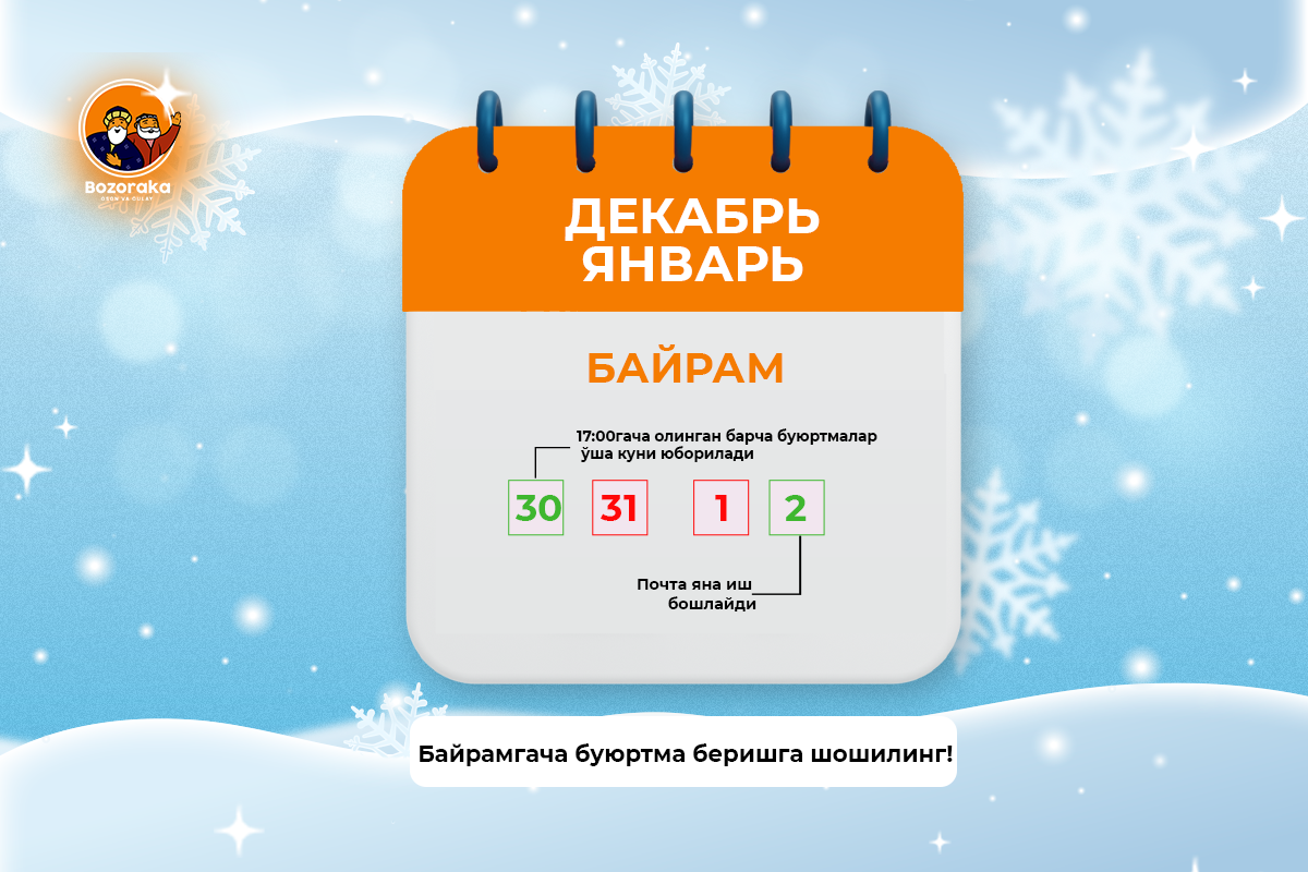 30 декабрь соат 17:00 га қадар қилинган буюртмалар ўша куннинг ўзида жўнатилади. Ушбу вақтдан кейин қилинган буюртмалар 2 январдан бошлаб юборилади.